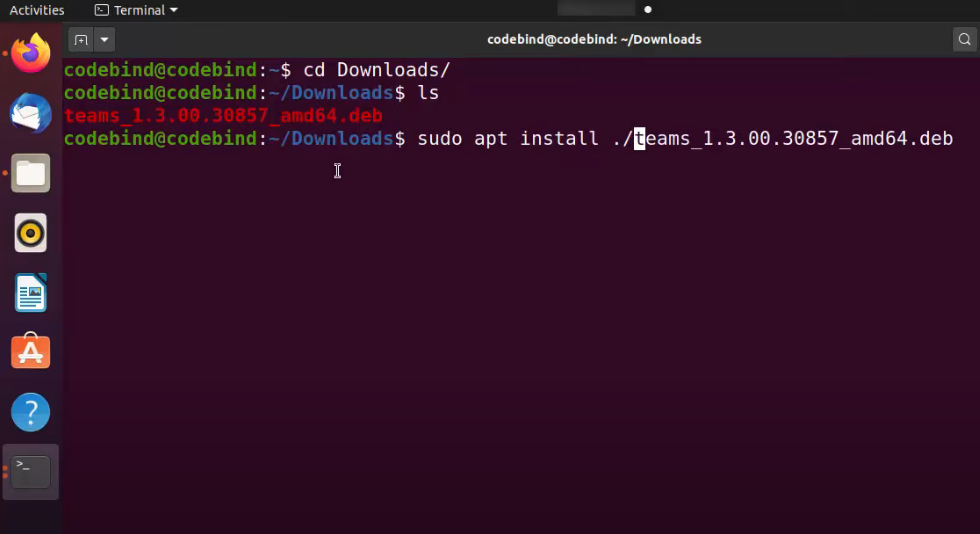 8. The second option is the $ sudo apt install ./teams and press the tab on your keyboard which will automatically enter the rest. This command will also install teams.