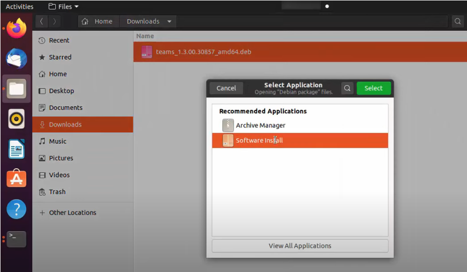 9. If you are not a terminal user and want to install Microsoft Teams app then right-click on the file in the downloads. Right-click on the deb file and click on open with other applications. Here choose Software Install and click on the select option.