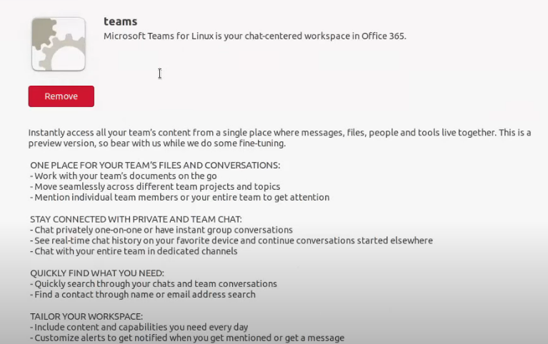 Once Microsoft Teams is installed in your Ubuntu operating system you will be able to see the Remove option in the window. Using this remove button you can remove Microsoft Teams in the future. You can also remove it from the Ubuntu software center as well.