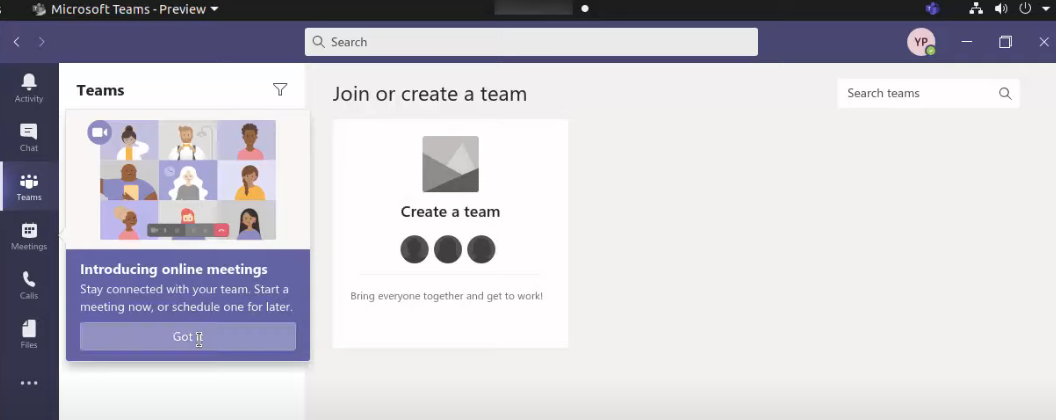 11. It will load Microsoft Teams in your Ubuntu operating system. After that, it will be logged in with your Microsoft account. If you have any teams, you can choose your team under Welcome to Teams. If you don’t have any team then click on Continue. Your Teams will start successfully. Here you can see the option called Create a Team. If you are a first-time user, it will guide you through every step.