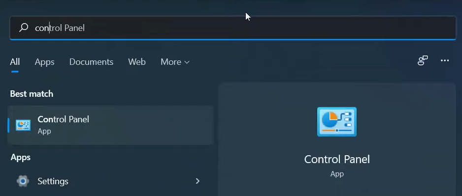 1. Click on the Search icon and search for the Control Panel app.