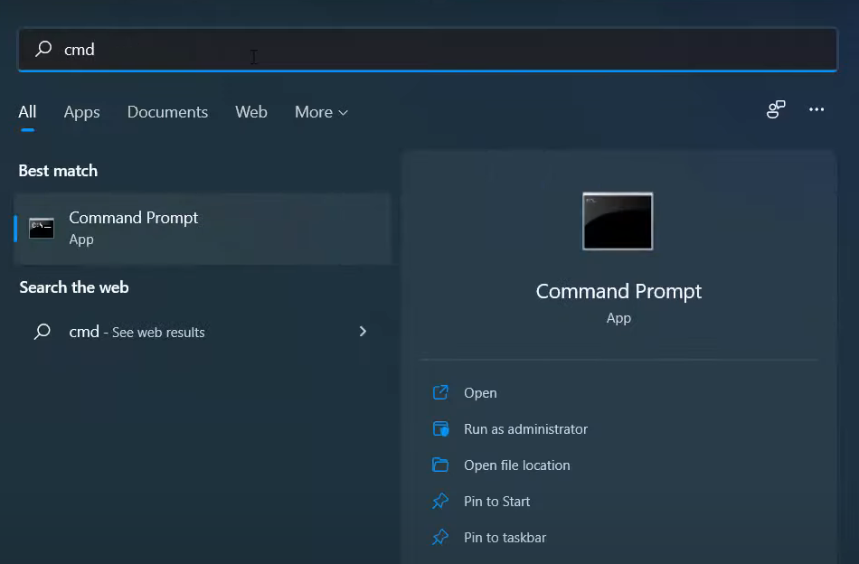 9. Click on the Search icon and search for the Command prompt. Then click on Run as administrator from the list of options provided on the right-hand side.