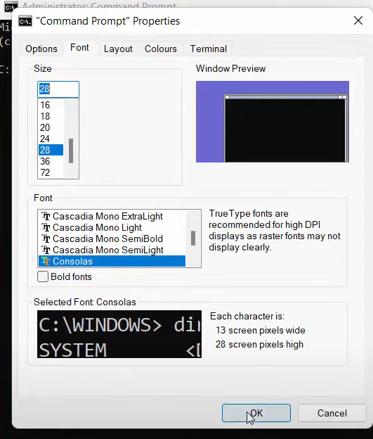 11. Let’s increase the font size of the command prompt. Click on Properties. Click on Font. In the font section, you will be able to see the dropdown list. You can change the font size according to your choice. I have changed it to a higher number.