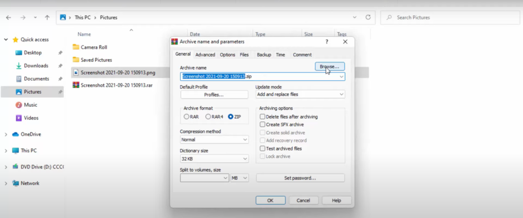 13. Here, you can choose the extension of the file. I am going to choose the Zip option. You can change the name and destination of your file as well. One interesting feature about WinRAR is you can set a password for your Zip file. using the Set Password option. It will allow you to set a password for your file. Then click on Ok.
