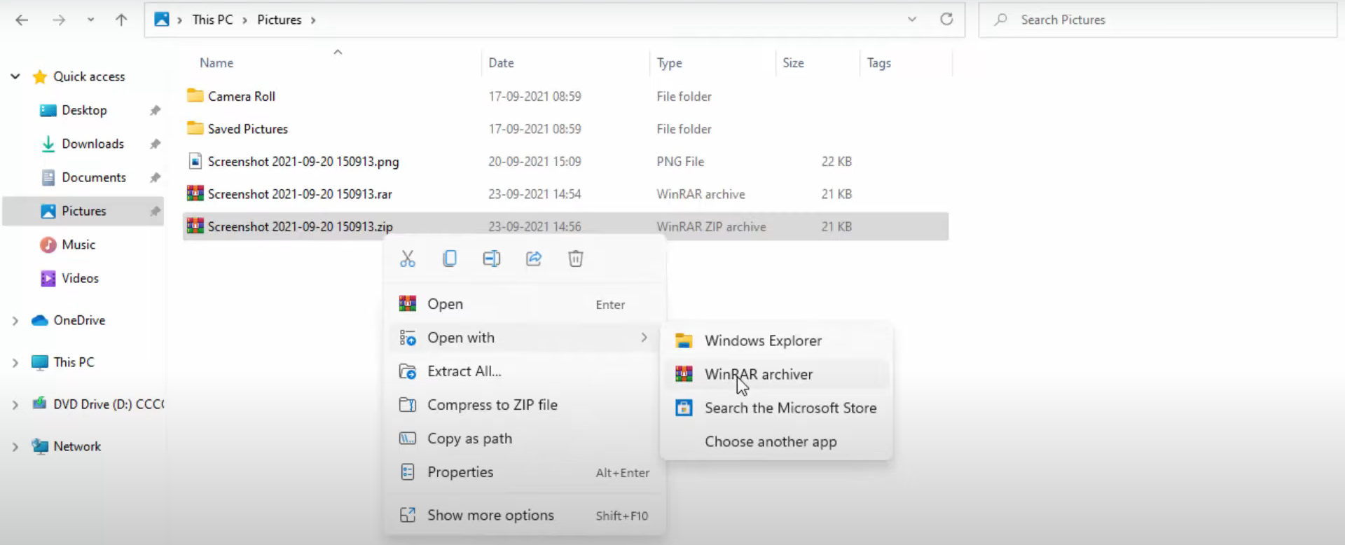 14. The Zip file has been created. To extract the zip file, right-click on it. Then click on the Extract all option. Or you can click on Open with WinRAR archiver. It will open the WinRAR window. You can see the compressed file here.