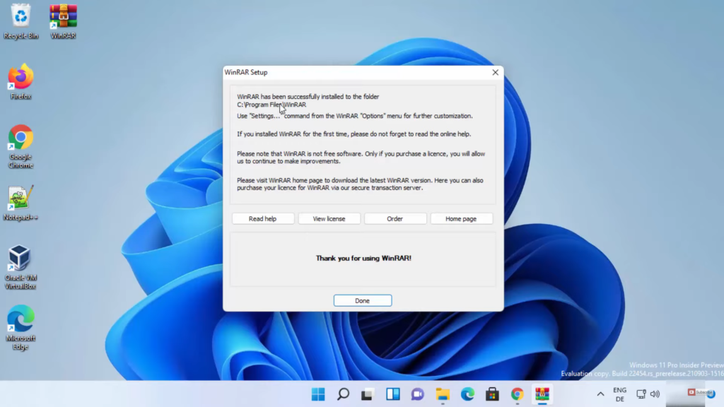 7. It will show you a message that WinRAR has been successfully installed. Click on Done.