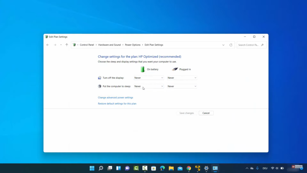 9. Since we have already chosen Never in the settings app, all these options are turned into never. When you click on Restore default settings for this plan, it will restore them to default.